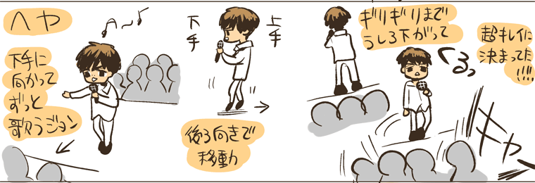 このジョンの振り返りを上から見てたんだけど、振り向いた瞬間客席がどわーってざわざわーって動いてて、めっちゃキレイに決まってたね!!!