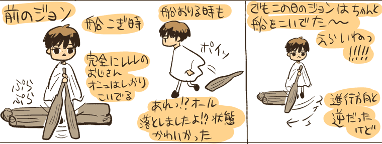 船降りる時も一番最後で、オールをしゃがんでそっと置いてて、すごいー!!!船こいでる人みたい!!><船主みたい!!><この船はオレが守る(`・∀・´)みたいー!!